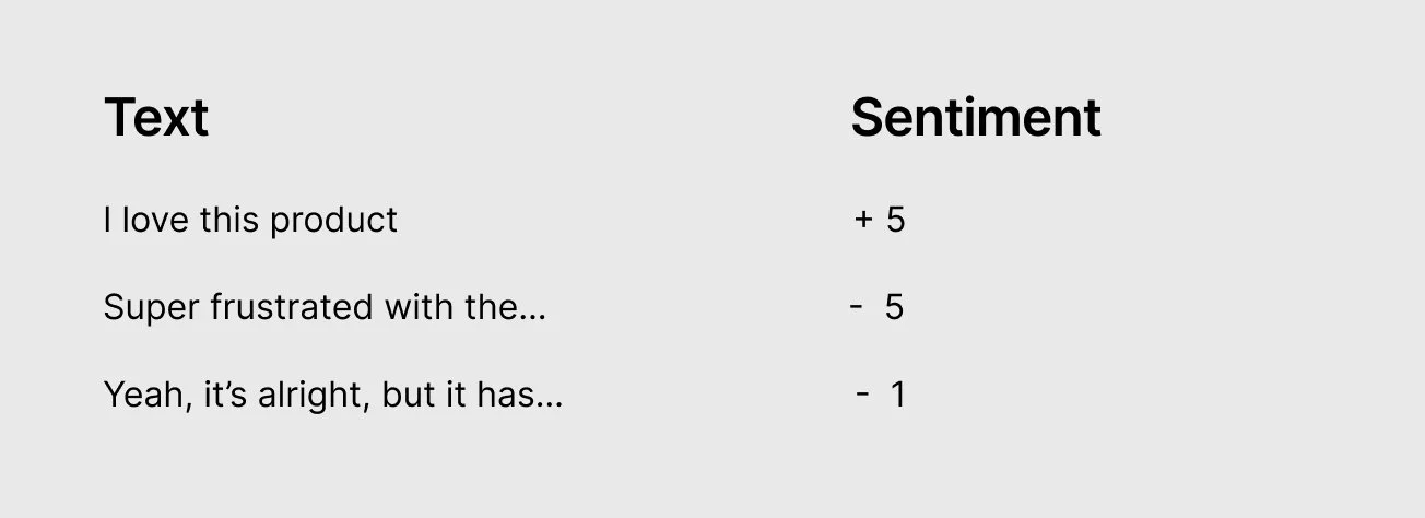 Example: You want to quickly identify users’ sentiment towards your service. You’ve got a bunch of messages or comments. Using a sentiment analysis model you can quickly get values from -1 to +1 and then transform those into star ratings, etc – for example: “I loved your service”: 5, “I am so frustrated”: 1.